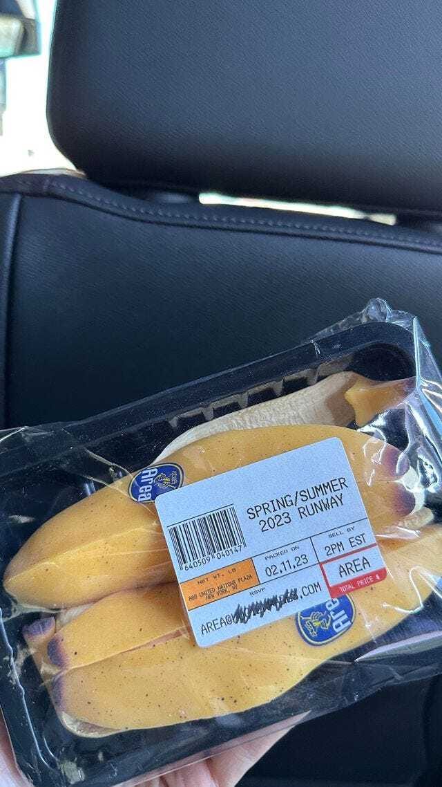 1 - Remember when Balenciaga sent out fashion show invitations on smashed iPhones? And everyone was like OMG? There’s something about turning trash into invites to showcases of the world’s most expensive clothing that really gets fashion people intrigued. Area designer Piotrek Panszczyk certainly had me piqued when he sent out invitations comprised of paper bags, a fake crumpled receipt, and rubber partially peeled bananas. Instagram fashion partnerships head Eva Chen showed how stunningly realistic these invites were. They were also — I’ll take her word for it — scented.