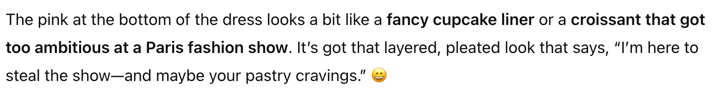 This dress looked better in the sketch the brand sent to media, but the bottom looked like, as one friend said to me, “a singular animal hoof.” I asked ChatGPT to compare the pink part to something funny, and I’m not saying the Emily in Paris writers should be worried, but:
