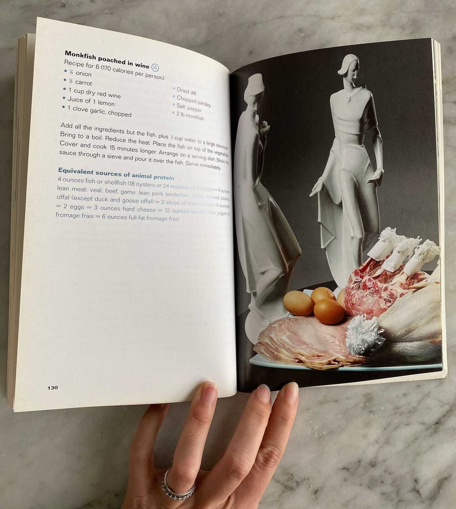 A large chunk of the book contains recipes and suggested meal plans. Karl’s “summer diet” is outlined. (The difference between “summer” and “winter” meal plans isn’t exactly specified, but a suggested summer breakfast includes cold yogurt and fruit while a winter breakfast includes an egg — yes, one sad little egg to keep you warm — fried without oil.) A summer day for Karl began with a glass of water. He moved onto breakfast including bread with low-fat butter, low-fat yogurt or cheese, and coffee or tea; lunch including two sachets, vegetables, and yogurt; and then dinner, for which the book suggests a number of options that would be completely alien in most American households — but perhaps slightly less alien to the hipster demographic Karl undertook the diet to join. Dinner choices include: