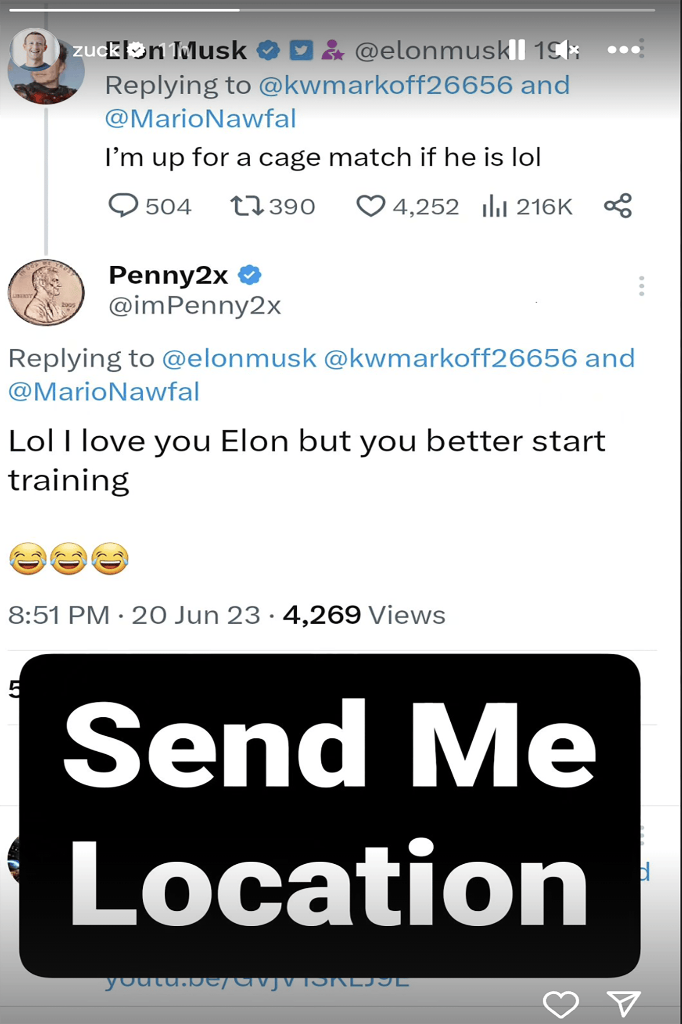 Hot Girl Summer originator Megan Thee Stallion has said, “It's just basically about women (and men) being unapologetically them, just having a good-ass time, hyping up your friends, doing you, not giving a damn about what nobody gotta say about it.” Maybe that very energy inspired Zuckerberg to reply to Elon Musk’s June tweet, “I’m up for a cage match if he [Zuckerberg] is,” with “Send Me Location” in an Instagram story:
