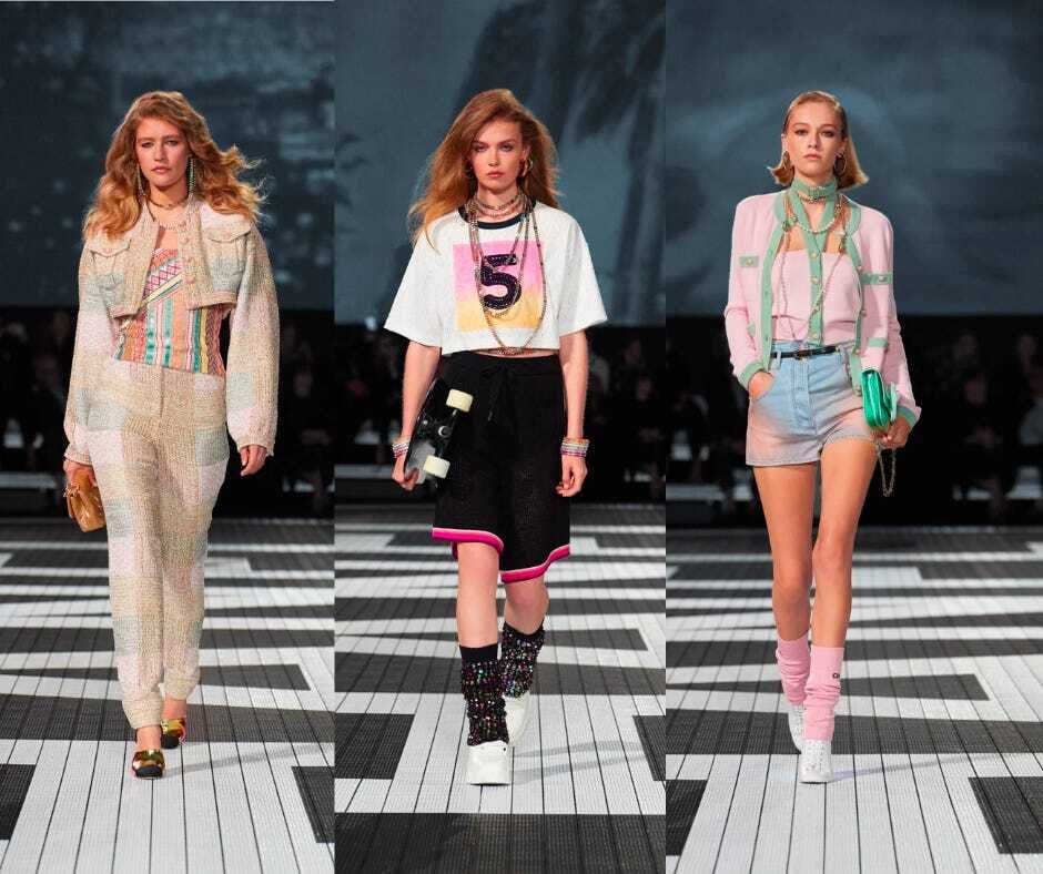 …[Chanel creative director Virginie] Viard didn’t look at the silver screen or the red carpet for inspiration, but to what appeared to be a more quotidian example of Los Angeles: the Venice Beach boardwalk, a see-and-be-seen playground for roller skaters, weight lifters, beach bunnies, and epic sunsets. “I thought let’s do Jane Fonda, Cindy Crawford—all our heroines,” she said at the “accessoirsation” of the collection a day before the show. “There are jeans, a more aerobic feeling; every show is the occasion to do something we’ve never done before.”