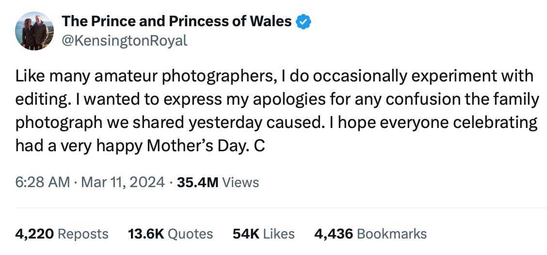 There are good reasons for the public to wonder what’s actually going on with Kate Middleton. Fellow Substacker explains this all very well in her So Many Thoughts newsletter. But to quickly recap: the Palace usually doesn’t make such blatant PR blunders. “Kate is so punctilious about her own image… she is a perfectionist, so the mess of this picture is a curious thing,” Princess Diana biographer Tina Brown told CBS This Morning, calling the the Mother’s Day photo debacle “chaos.” Also, the Palace has provided scant information on Kate’s medical condition, which sounds serious. Meanwhile, it has been more forthcoming about King Charles following his cancer diagnosis. Notes People: