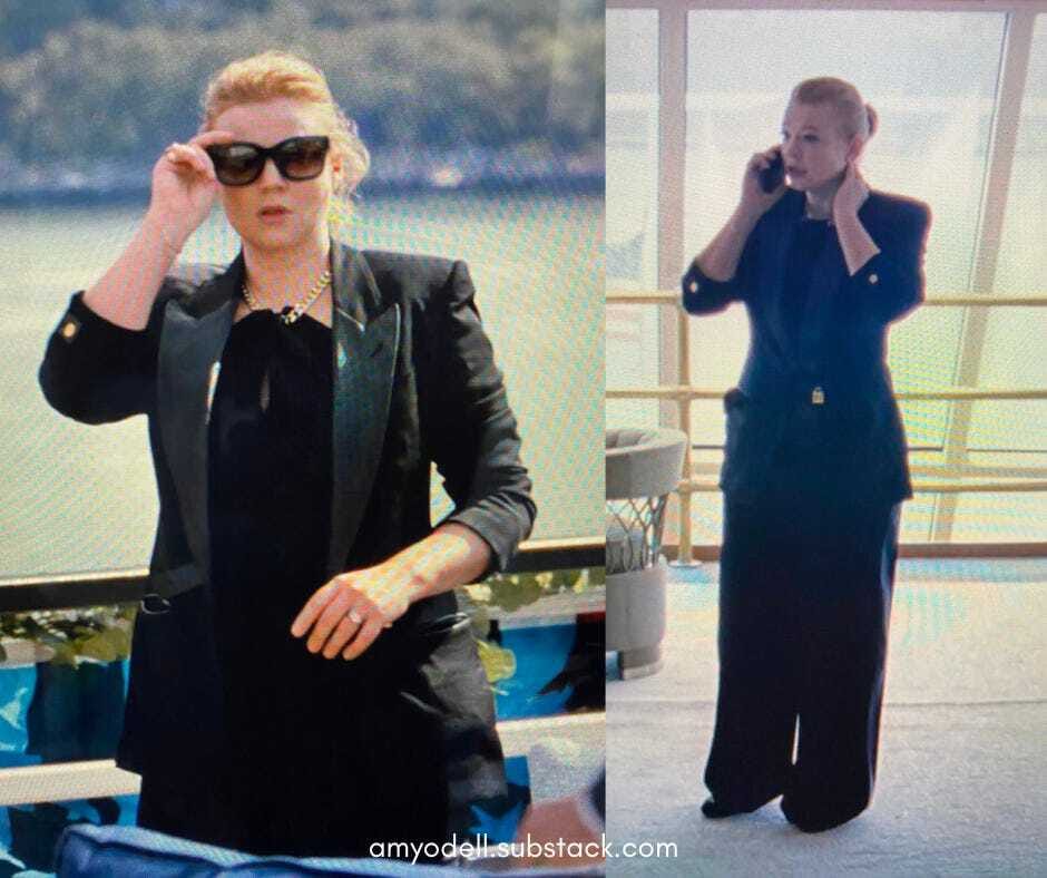 Shiv looked fabulous in her chain-neck halter top and blazer, which had a lock for a clasp, by Tom Ford. As the episode progresses and more of her outfit comes into frame, we see that she’s wearing wide-legged trousers, which gave her look a party on the top, business on the bottom vibe. She surely thought she would get to spend this day as only a Roy would want to: conducting business from her brother’s wedding, dipping out after the salad course to make phone calls and stress out.