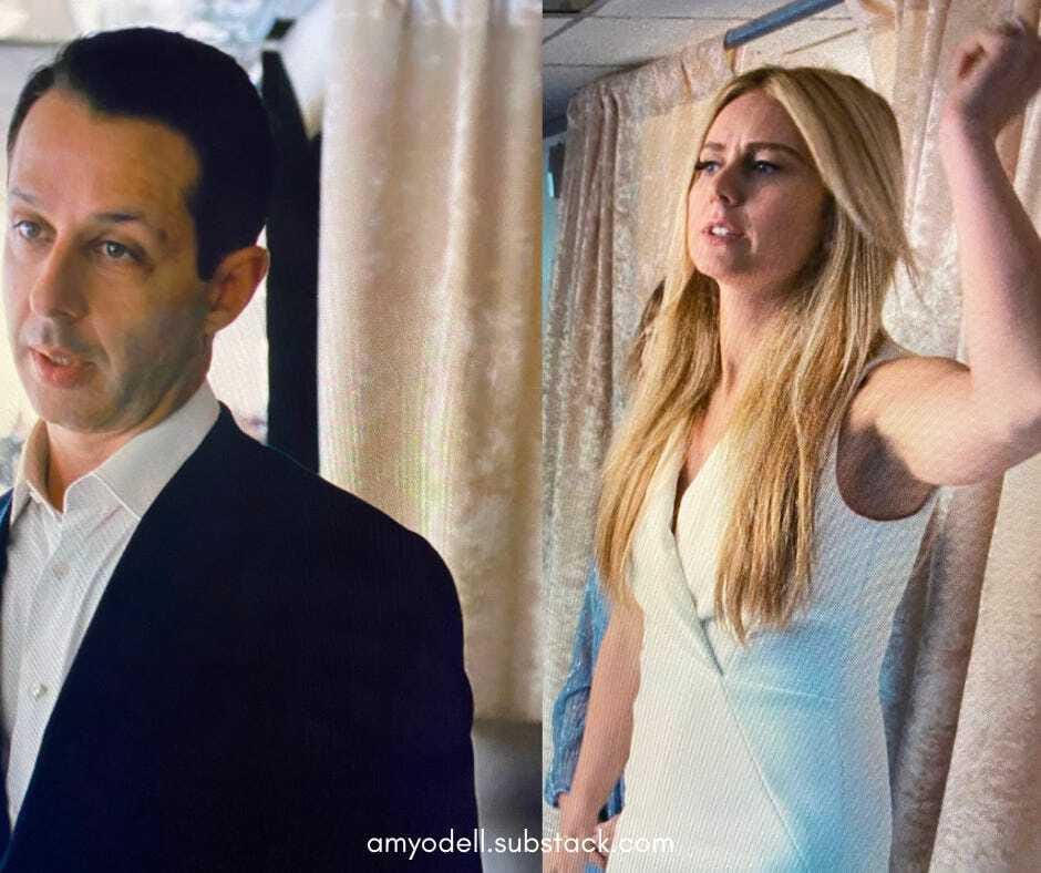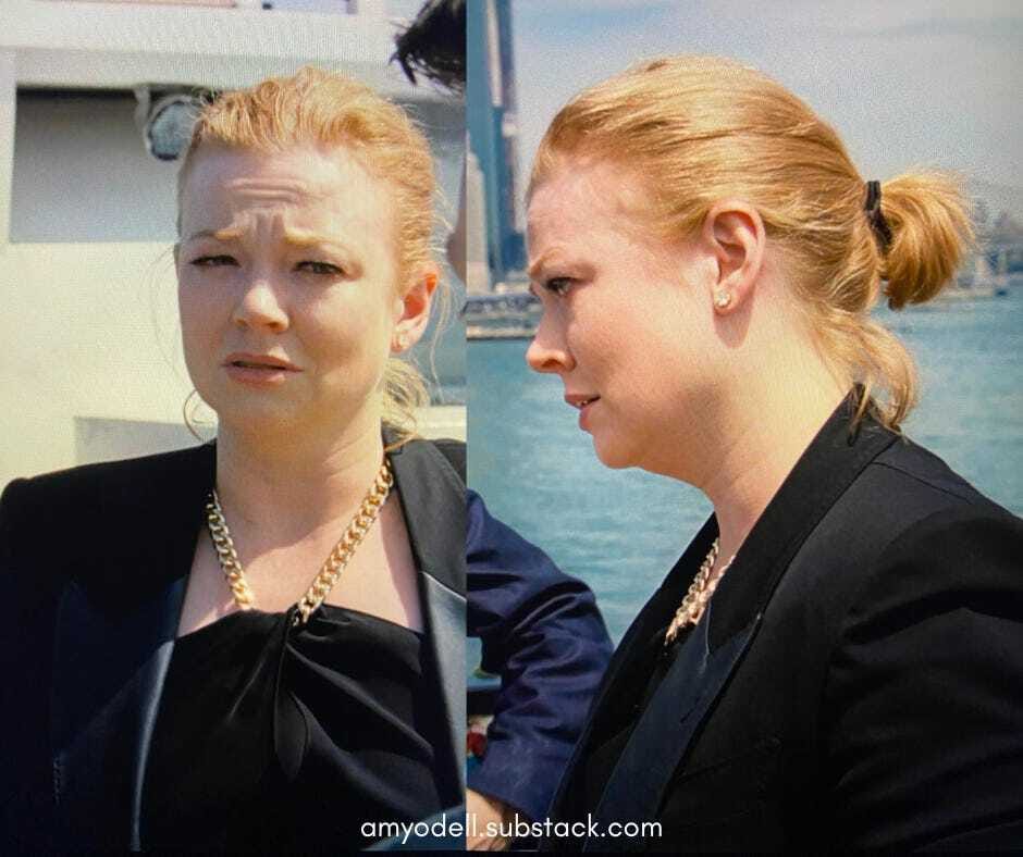 Kerry was brilliantly costumed in another trendy look — this time a brown suit — with the flashy accessories of someone who grew up middle class. The costume team cleverly juxtaposed Shiv’s gold accents — those of a true Tom Ford woman — with Kerry’s — those of a Reformation shopper.