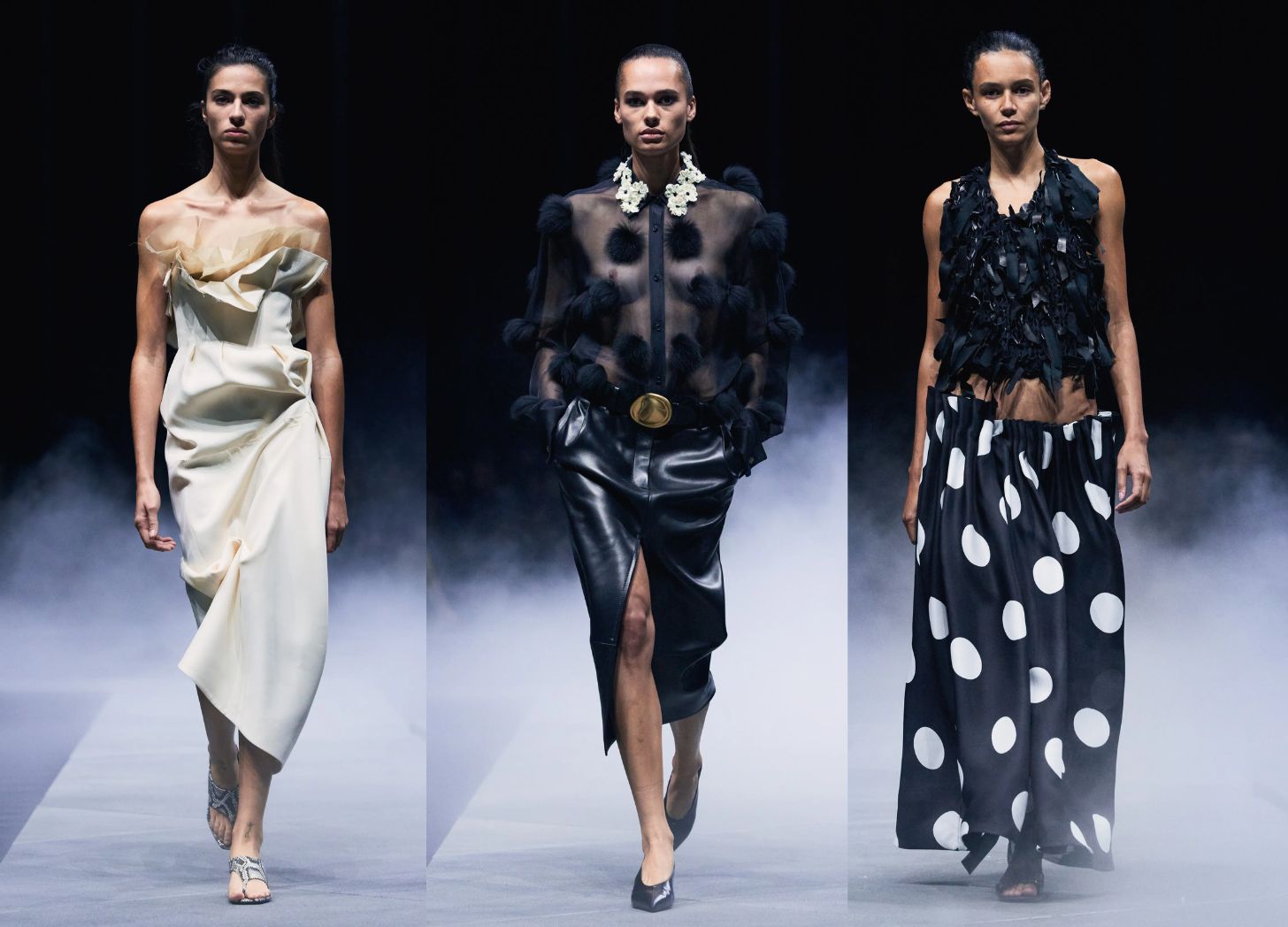 I also heard people talk about how Khaite suffered from a lack of editing. Designer Catherine Holstein has built a powerful brand and following, and is wisely embracing the whole “leopard is a neutral” thing in our tacky times. But how to explain the purposeful bulk sewn into her cocktail dresses, sheer blouse adorned with black poufs, and chunky polka dot maxi skirts with asymmetrical pleats?