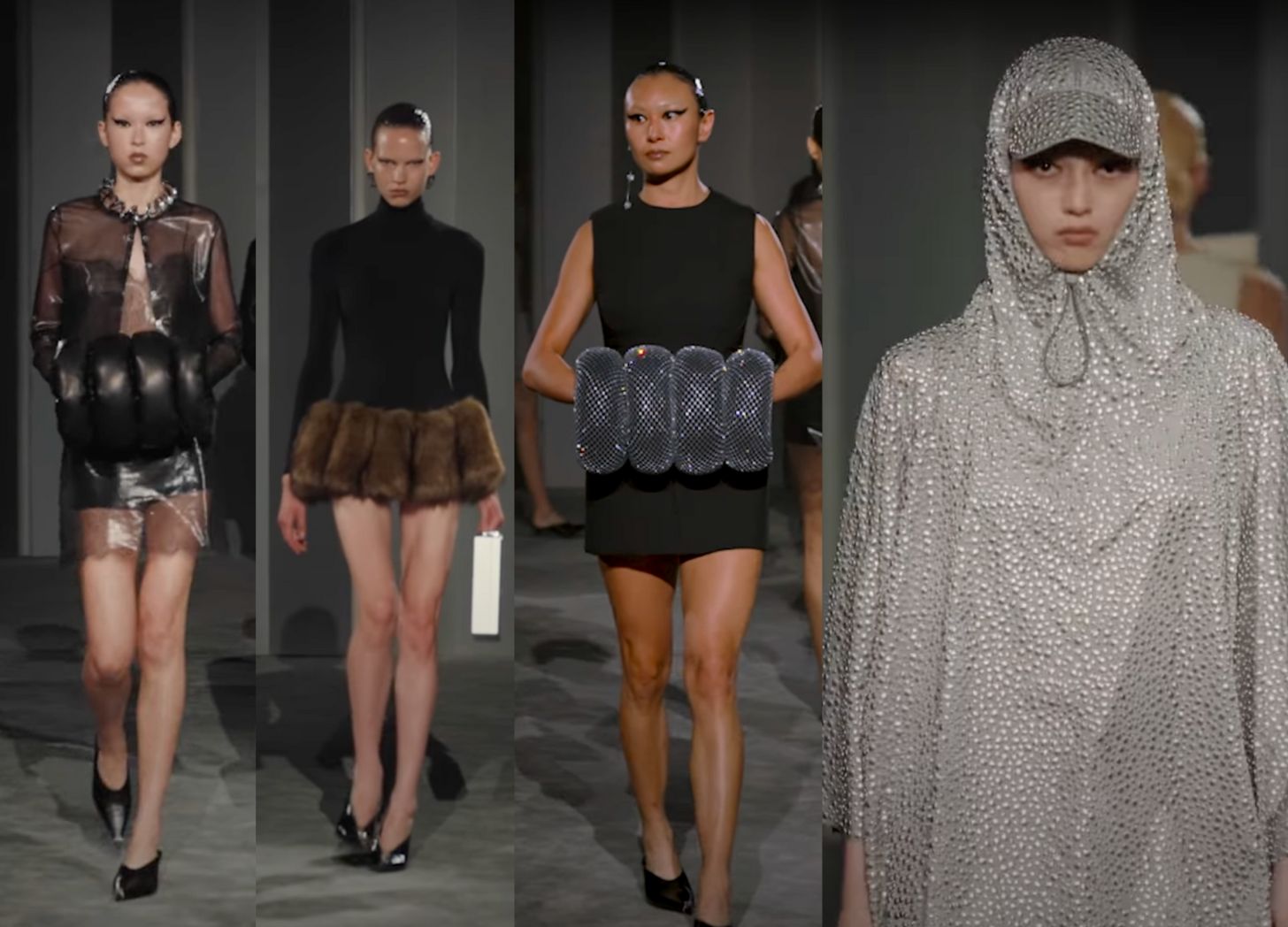 Wang’s show included brown faux fur mini skirts; muffs that looked like puffy jackets; and neck braces in that same style. Typical Wang fare of tight black dresses and skirts was not in short supply — but he wasn’t the only designer who seemed to be trying to meet the moment of tacky we now find ourselves in. A fully silver studded hooded poncho? Sure, anything to distract from the horrors of 2025.