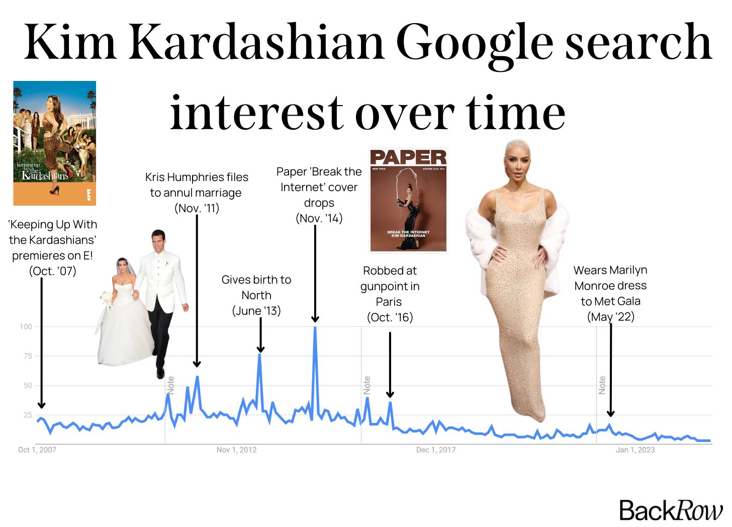 If you look at her Google search interest, she peaked in the early 2010s, and has been on a slow decline, with a small bump around the 2022 Met Gala and a steady downward slope from there. The biggest spike in interest was when Paper magazine dropped her nude editorial and cover. Though her high-fashion profile increased from that moment, she’s been in steady decline in overall search interest since, this past year being the lowest search volume for her since Keeping Up With the Kardashians premiered in 2007.
